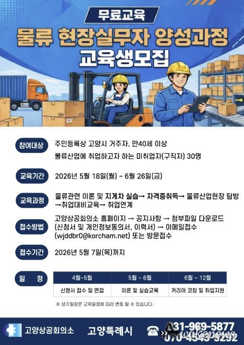 어웨이크뉴스 오경하 기자 | 고양특례시는 2026년 고양맞춤형 일자리학교 공모에 선정된 ‘물류 현장실무자 양성과정’에 참여할 교육생을 오는 5월 7일까지 모집한다.