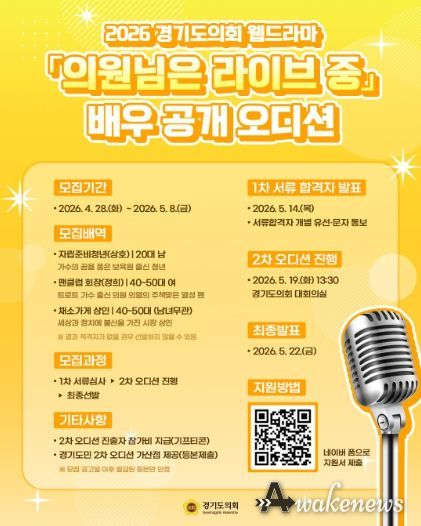 어웨이크뉴스 오경하 기자 | 경기도의회는 2026년도 경기도의회 웹드라마 ‘의원님은 라이브 중(가제)’에 출연할 배우를 공개 모집하기 위해 오디션을 개최한다.