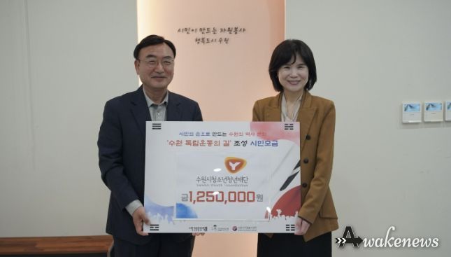 어웨이크뉴스 오경하 기자 | 수원시청소년청년재단은 28일, 수원시자원봉사센터와 수원 독립운동의 길 추진위원회가 주관하는 ‘수원 독립운동의 길’ 조성 시민 모금에 재단 임직원이 자율적으로 모금한 125만원을 기부했다고 밝혔다.