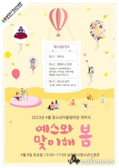 어웨이크뉴스 오경하 기자 | 남양주도시공사 남양주시청소년수련관에서는 남양주시 청소년과 시민들에게 문화예술공연, 체험활동 등 다양한 즐길거리를 제공하고 건전한 여가생활을 지원하는 2023년도 첫 번째 청소년어울림마당을 YES와 맞이해‘봄’ 주제로 오는 4월 8일 13:00시부터 17:00까지 남양주시청소년수련관 주차장에서 개최한다고 밝혔다.