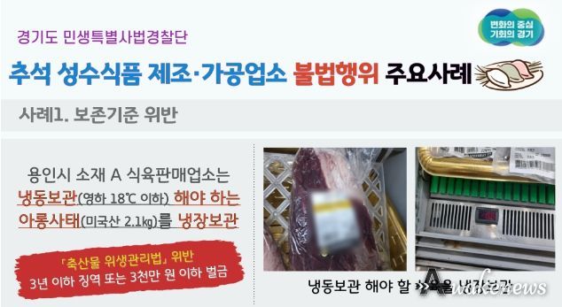 주요 위반 사례를 보면 용인시 소재 A 식육판매업체는 영하 18℃ 이하로 냉동 보관해야 하는 아롱사태(미국산 2.1kg)를 영하 0.8℃ 정도의 냉장고에 보관하다 적발됐다.