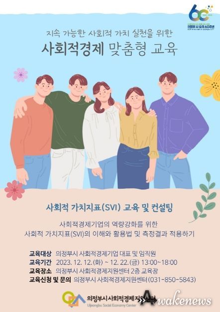어웨이크뉴스 오경하 기자 | 의정부시는 의정부시 사회적경제지원센터가 ‘2023년 의정부시 사회적경제 맞춤형 교육_사회적 가치지표(SVI) 이해 및 활용’ 교육생을 12월 11일까지 모집한다고 밝혔다.