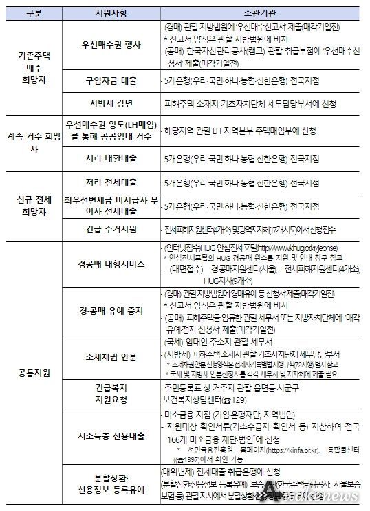 전세사기로 어려움을 겪고 있는 임차인은 거주지 관할 시・도에 피해자 결정 신청을 할 수 있고, 위원회 의결을 거쳐 피해자로 결정된 자는 주택도시보증공사(HUG) 전세피해지원센터(대면・유선) 및 지사(대면)를 통해 지원대책에 대한 자세한 안내를 받을 수 있다.