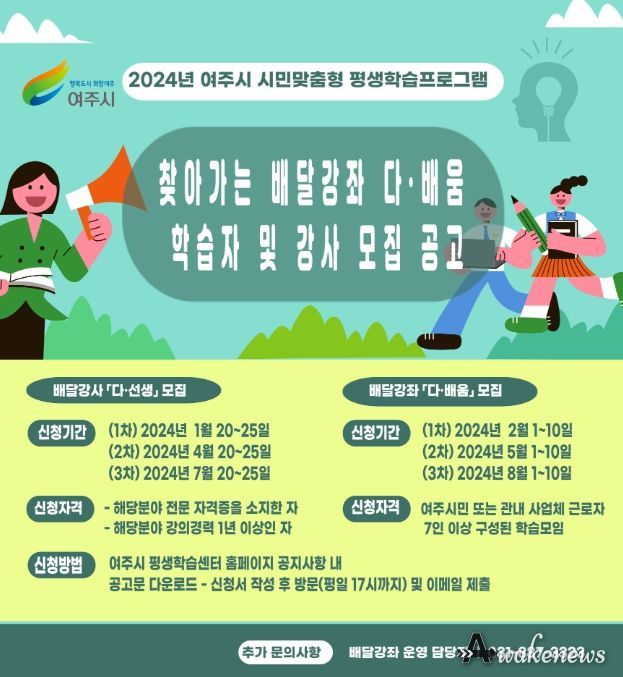 어웨이크뉴스 오경하 기자 | 여주시 평생교육과에서는 평생학습 사각지대 주민의 학습권 보장과 시·공간 제약 없는 시민 맞춤형 평생학습 프로그램을 제공하고자 “찾아가는 배달강좌 '다·배움' 학습자 및 배달강사 '다·선생'” 을 모집한다.