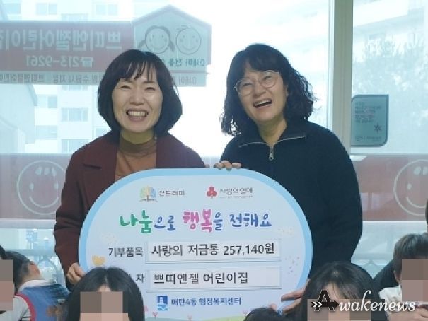 어웨이크뉴스 오경하 기자 | 지난 19일, 수원시 영통구 매탄4동 소재 쁘띠엔젤 어린이집은 어린이집 원아들과 김미영 원장이 함께 모은‘사랑의 저금통’을 전달했다.