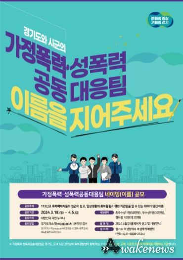 어웨이크뉴스 오경하 기자 | 경기도가 3월 18일부터 4월 5일까지 ‘가정폭력·성폭력공동대응팀’ 이름 공모전을 전 국민을 대상으로 연다.