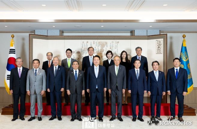 어웨이크뉴스 오경하 기자 | 윤석열 대통령은 10월 18일 오후 제31회 한일재계회의(10/17~18, 서울) 참석차 방한(訪韓) 중인 일본 경제단체연합회 도쿠라 마사카즈 회장을 비롯한 일본 경제인 대표단을 접견했다. 접견에는 한국경제인협회 류진 회장을 비롯한 한국 기업인들도 함께 참석했다.