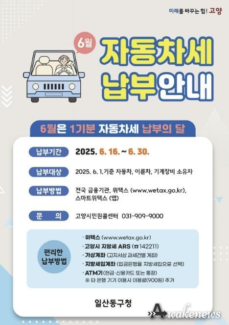어웨이크뉴스 오경하 기자 | 고양특례시 일산동구는 2025년 제1기분 자동차세 총 90,973건, 약 124억 원을 부과하고, 6월 13일 고지서를 발송했다.
