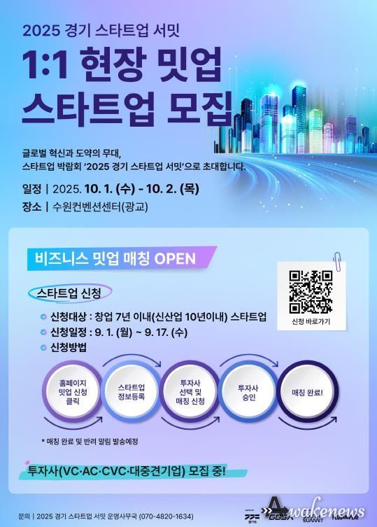 어웨이크뉴스 오경하 기자 | 경기도와 경기도경제과학진흥원은 오는 10월 1일부터 2일까지 수원컨벤션센터에서 개최되는 ‘2025 경기 스타트업 서밋(G-SUMMIT 2025)’의 핵심 프로그램 ‘1:1 현장 밋업(Meet-up)’ 참가 스타트업을 9월 17일까지 모집한다.