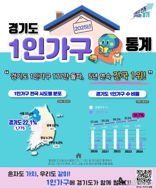 어웨이크뉴스 오경하 기자 | 경기도 1인가구는 177만 가구이며, 도 전체 가구 가운데 31.7%를 차지하고 있는 것으로 나타났다. 경기도의 1인가구 수는 2020년부터 매년 전국 최고치를 경신하고 있다.