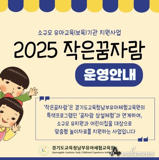 어웨이크뉴스 오경하 기자 | 경기도교육청남부유아체험교육원이 소규모 유치원과 어린이집을 대상으로 맞춤형 놀이자료 지원 프로그램 ‘2025 작은꿈자람’을 운영한다.