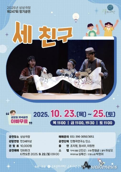 어웨이크뉴스 오경하 기자 | 군포문화재단 군포시평생학습원 상상극장은 오는 10월 23일부터 25일까지 가족 모두가 즐길 수 있는 인형극‘세 친구’를 정기공연으로 무대에 올린다.