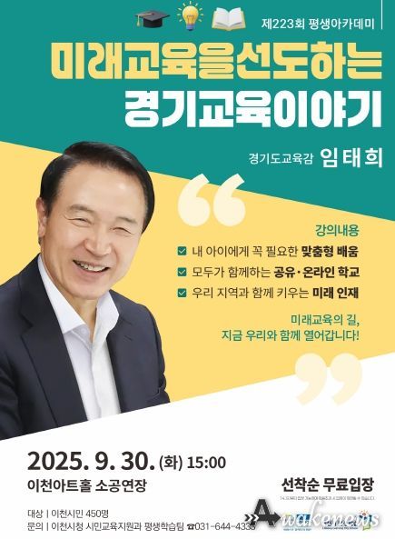 어웨이크뉴스 오경하 기자 | 이천시는 9월 30일 오후 3시, 이천아트홀 소공연장에서 임태희 경기도교육감을 초청해 “미래교육을 선도하는 경기교육 이야기”라는 주제로 제 223회 이천 평생아카데미를 개최한다.