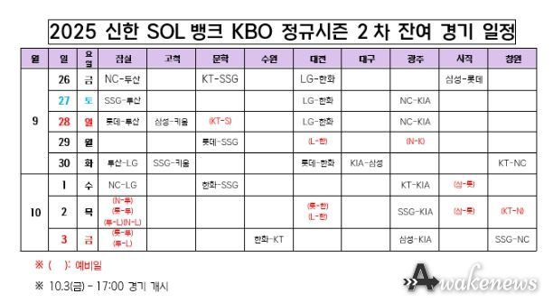 어웨이크뉴스 오경하 기자 | KBO는 26일(금) 2025 신한 SOL뱅크 KBO 정규시즌 2차 잔여 경기 일정을 확정했다.