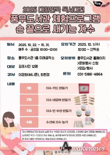 어웨이크뉴스 오경하 기자 | 김포시 풍무도서관은 2025 대한민국 독서대전 사업의 일환으로 오는 10월 22일부터 31일까지 총 4회에 걸쳐 수·금요일 오전 10시부터 12시까지 ‘손 끝으로 새기는 자수’를 운영한다.