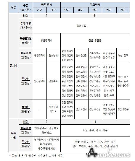 올해는 충청북도가 대통령상인 종합대상을, 부산광역시(광역자치단체 부분)와 전남 무안군(기초자치단체 부문)이 국무총리상인 부문별 대상을 받는 등 총 64개 자치단체가 수상의 영예를 안았다.