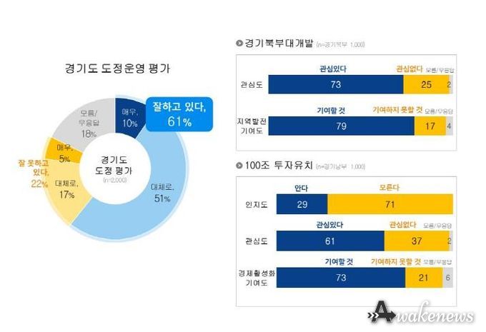 어웨이크뉴스 오경하 기자 | 경기도민 10명 중 6명이 도정 운영을 긍정적으로 평가한 것으로 나타났다.