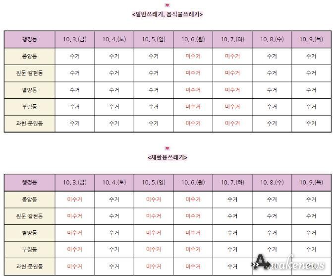생활폐기물 수거는 일반 쓰레기의 경우 3일, 4일, 5일, 8일, 9일에, 재활용 쓰레기는 4일, 7일, 8일, 9일에 각각 수거된다.