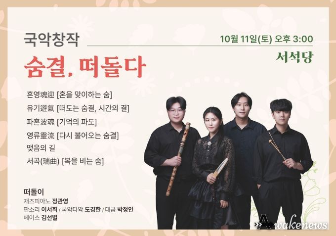 어웨이크뉴스 오경하 기자 | 광주문화재단(대표이사 노희용) 전통문화관은 오는 10월 11일 오후 3시, 토요 상설공연 22회차로 퓨전국악 단체 떠돌이의 '숨결, 떠돌다' 무대를 선보인다.