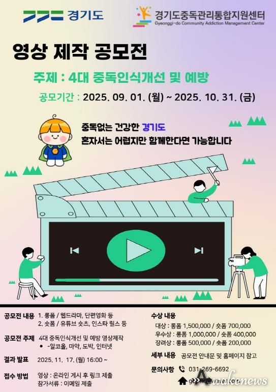 어웨이크뉴스 오경하 기자 | 경기도와 경기도중독관리통합지원센터가 ‘2025년 중독예방 영상 공모전’을 개최한다. 이번 공모전은 전 도민을 대상으로 알코올, 마약, 도박, 인터넷 4대 중독에 대한 위험성과 경각심을 높이고 예방 문화를 확산하기 위해 마련됐다.