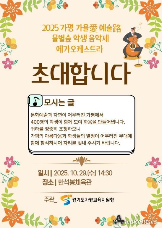 어웨이크뉴스 오경하 기자 | 경기도가평교육지원청이 주관하는 ‘2025 가평 가을愛 예술路 물별숲 학생 음악제 메가오케스트라’가 10월 29일 오후 2시 30분, 가평군 한석봉체육관에서 열린다.