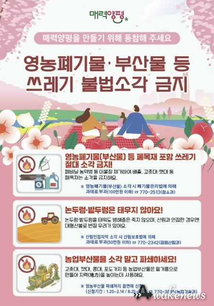 또한, 감시원들은 지역 경로당과 마을회관 등을 방문해 영농부산물의 올바른 처리 방법을 안내하고, 불법소각 금지 홍보물을 배부하는 등 불법소각 근절에 만전을 기할 예정이다.