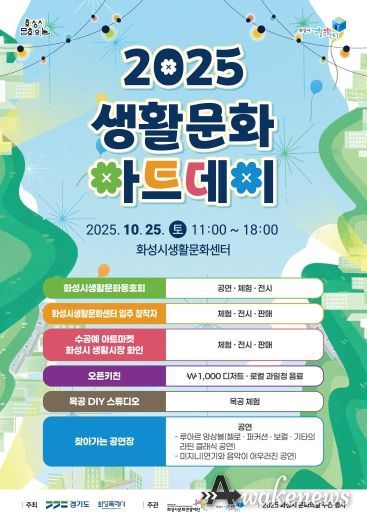 어웨이크뉴스 오경하 기자 | 화성시문화관광재단(대표이사 안필연)은 오는 10월 25일 토요일에 화성시생활문화센터에서 ‘2025 생활문화 아트데이’를 개최한다. 이번 행사는 ‘2025 화성시 문화의 날’ 주간을 맞아 시민들에게 생활문화를 체험하고 즐길 수 있는 기회를 제공하고, 지역 생활문화 활동가의 활동 기반을 마련하기 위해 기획됐다.