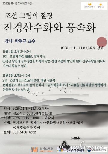 어웨이크뉴스 오경하 기자 | 김포시 장기도서관은 2025년 도서관 지혜학교 특강으로 '조선 그림의 절경 진경산수화와 풍속화'를 오는 11월 1일, 11월 8일 오후 2시부터 5시까지 장기도서관 대강당에서 운영한다고 밝혔다