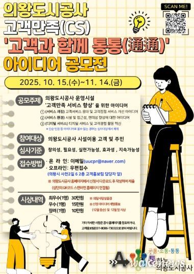 어웨이크뉴스 오경하 기자 | 의왕도시공사는 고객만족(CS) 아이디어 공모전‘고객과 함께 통통(通通)’을 추진한다고 밝혔다.