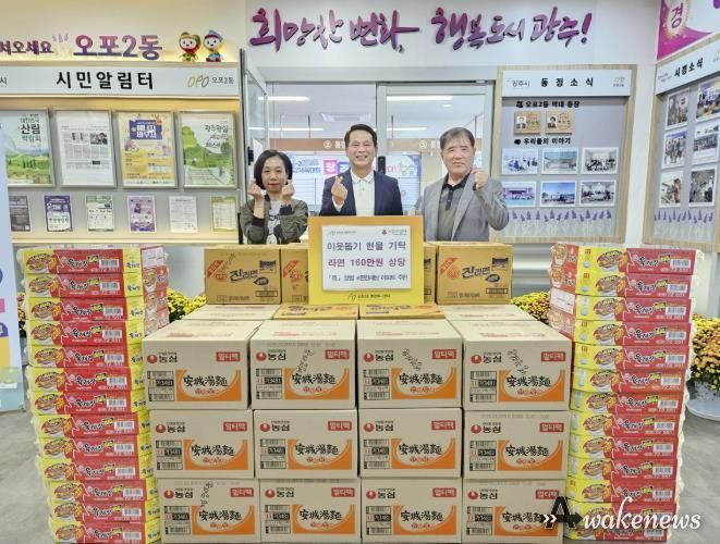 어웨이크뉴스 오경하 기자 | 광주시 양벌동 e편한세상 아파트 입주민들은 지난 16일 광주시 오포2동을 방문해 어려운 이웃을 돕기 위한 라면(160만 원 상당)을 기탁했다.