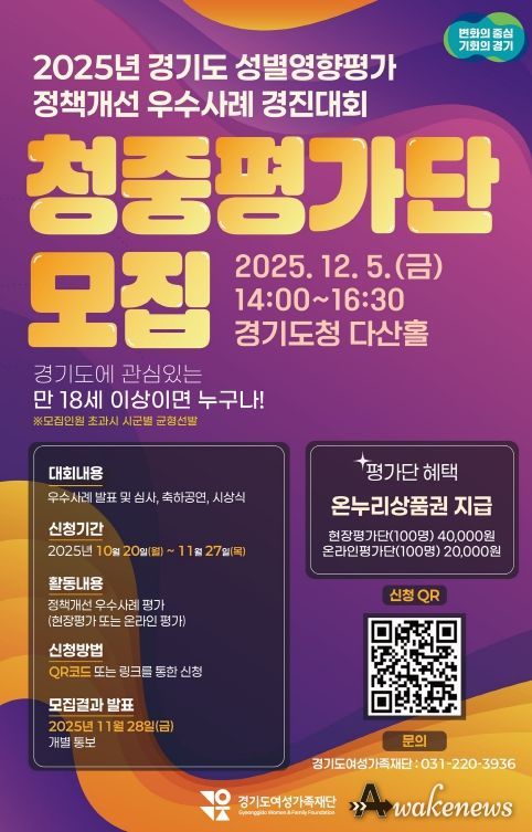 어웨이크뉴스 오경하 기자 | 경기도가 ‘2025년 경기도 성별영향평가 정책개선 우수사례 경진대회’에 참여해 우수 정책개선 사례를 평가할 청중평가단 200명을 11월 27일까지 모집한다.