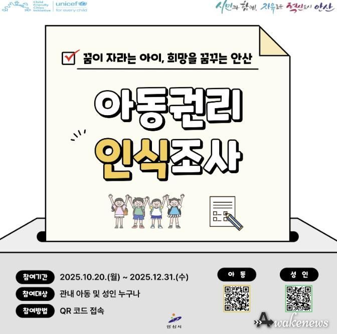 어웨이크뉴스 오경하 기자 | 안산시는 오는 12월 31일까지 ‘2025년 안산시 아동권리 인식조사’를 실시한다고 20일 밝혔다.