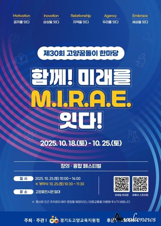 어웨이크뉴스 오경하 기자 | 경기도고양교육지원청은 오는 10월 25일 오전 10시부터 오후 4시까지 고양꽃전시장 일대에서 ‘제30회 고양꿈돌이한마당 창의융합 페스티벌’을 개최한다.