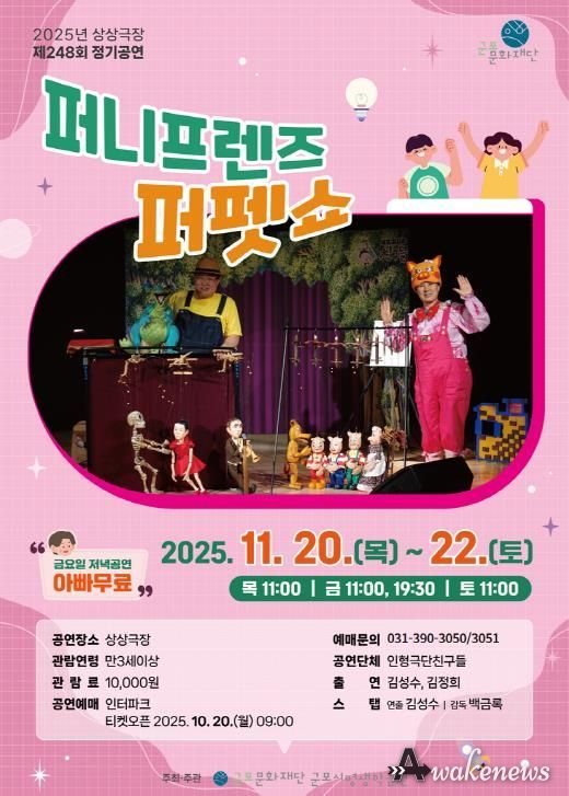 어웨이크뉴스 오경하 기자 | 군포문화재단 군포시평생학습원 상상극장은 오는 11월 20일부터 22일까지 정기공연으로 인형극 ‘퍼니프렌즈 퍼펫쇼’를 무대에 올린다.
