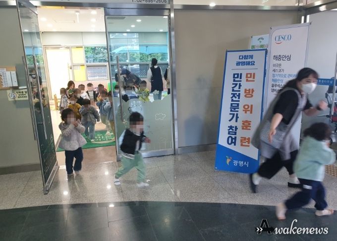 어웨이크뉴스 오경하 기자 | 광명시 일직동 행정복지센터는 23일 영유아와 어린이집 교사를 대상으로 화재 대비 훈련을 실시했다.