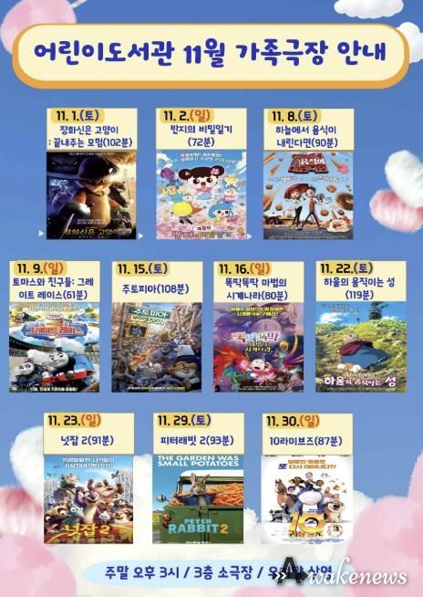 이번 11월 상영될 가족영화는 어린이와 가족 이용자들이 함께 웃고 공감할 수 있는 애니메이션 중심의 프로그램으로 구성됐으며, 관람료는 무료이다.