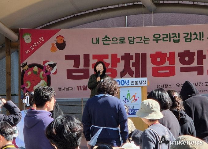 어웨이크뉴스 오경하 기자 | 경기도의회 교육기획위원회 김영희 의원(더불어민주당, 오산1)은 지난 2일 오산 오색시장 고객지원센터 광장에서 열린 김장체험학교 행사에 참석해 전통 김장 문화의 의미를 전했다.