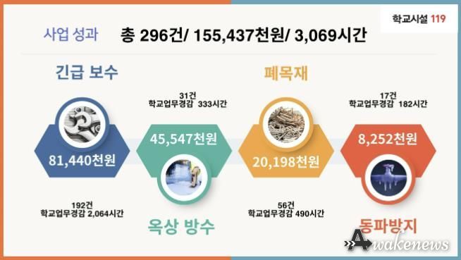 교육청이 직접 긴급 보수(192건), 옥상 방수(31건), 폐목재 무상 처리(56건) 등 학교가 자체적으로 해결하기 어려운 전문 분야까지 발 빠르게 지원한 결과, 외부 용역 대비 약 70%의 비용을 절감하는 효과를 거두었다.