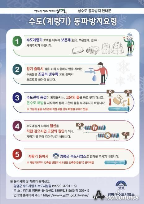 어웨이크뉴스 오경하 기자 | 양평군은 본격적인 한파에 대비해 군민들의 수돗물 사용 불편을 최소화하고 안정적인 급수 공급을 위해 ‘동절기 수도시설 동파방지 종합대책’을 수립·추진하고 있다.
