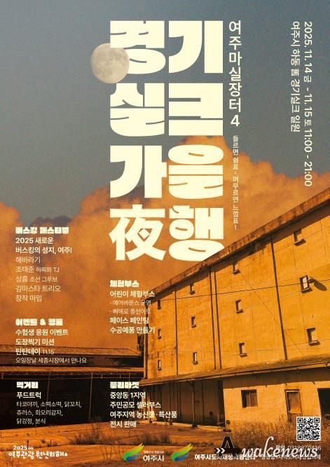 어웨이크뉴스 오경하 기자 | 여주시는 오는 11월 14일부터 15일까지 이틀간 여주 경기실크 일원(여주시 하동 123-6번지)에서 '여주마실장터4 가을야행'을 개최한다고 밝혔다. 이번 행사는 '2025 새로운 버스킹의 성지, 여주!'라는 슬로건 아래, 깊어가는 가을밤의 정취를 더할 버스킹 페스티벌과 함께 다채로운 마켓과 체험을 선보일 예정이다.