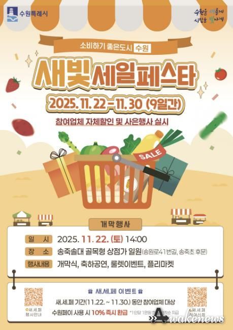 어웨이크뉴스 오경하 기자 | 수원특례시가 11월 22~30일 ‘제6회 새빛세일페스타 수원’을 연다. 개막 행사는 22일 오후 1~5시 송죽솔대 골목형 상점가 일원에서 개최된다.