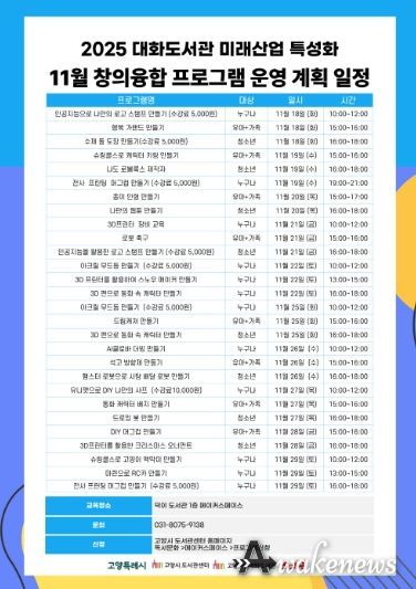 어웨이크뉴스 오경하 기자 | 고양특례시 대화도서관은 덕이도서관 1층 메이커스페이스(이전 공간)에서 초등학생부터 성인을 대상으로 11월 ‘미래산업 특성화 창의융합 프로그램’을 운영한다고 밝혔다.