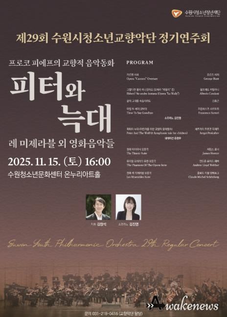 어웨이크뉴스 오경하 기자 | 수원시청소년청년재단 수원청소년문화센터에서는 오는 11월 15일 오후4시, 온누리아트홀에서 제29회 정기연주회를 개최한다. 이번 연주회는 ‘프로코 피에프의 교향적 음악동화 '피터와 늑대'’를 중심으로, 세대를 아우르는 감동의 영화음악을 함께 선보이며 청소년 단원들의 풍성한 음악적 성장을 보여줄 예정이다.