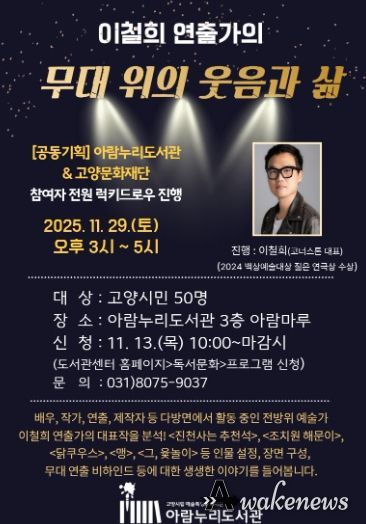 어웨이크뉴스 오경하 기자 | 고양특례시 아람누리도서관은 오는 29일 오후 3시, 2024년 제60회 백상예술대상 젊은 연극상 수상자인 이철희 연출가를 초청해 예술특성화 프로그램 ‘무대 위의 웃음과 삶’을 운영한다.