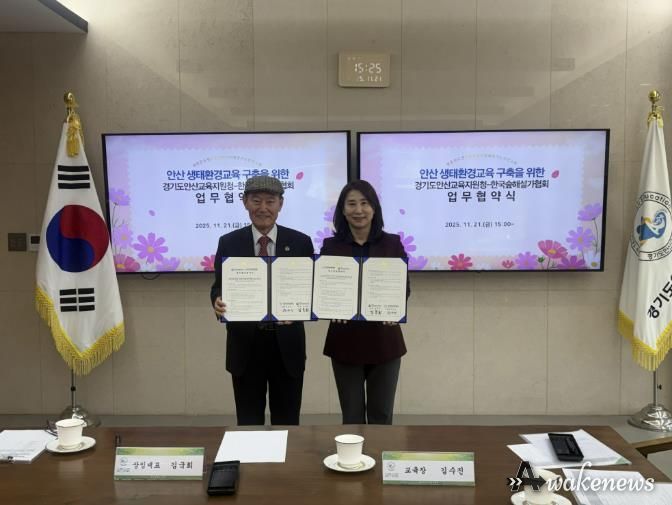 어웨이크뉴스 오경하 기자 | 경기도안산교육지원청은 11월 21일 15시, 안산교육지원청 동행관 3층에서 (사)한국숲해설가협회와 함께 지역 생태교육 활성화를 위한 업무협약(MOU)을 체결했다. 이번 협약은 학생들의 생태 감수성과 자연친화적 가치관을 길러주는 동시에, 교원의 생태·환경교육 전문성을 강화하기 위한 취지로 마련됐다.