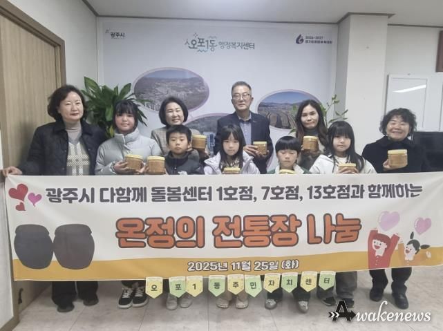 어웨이크뉴스 오경하 기자 | 광주시 다 함께 돌봄센터 1호점과 7호점, 13호점은 지난 25일 아이들과 함께 손수 만든 된장 1㎏ 62개(100만 원 상당)를 어려운 이웃을 위해 오포1동 행정복지센터에 기탁했다.