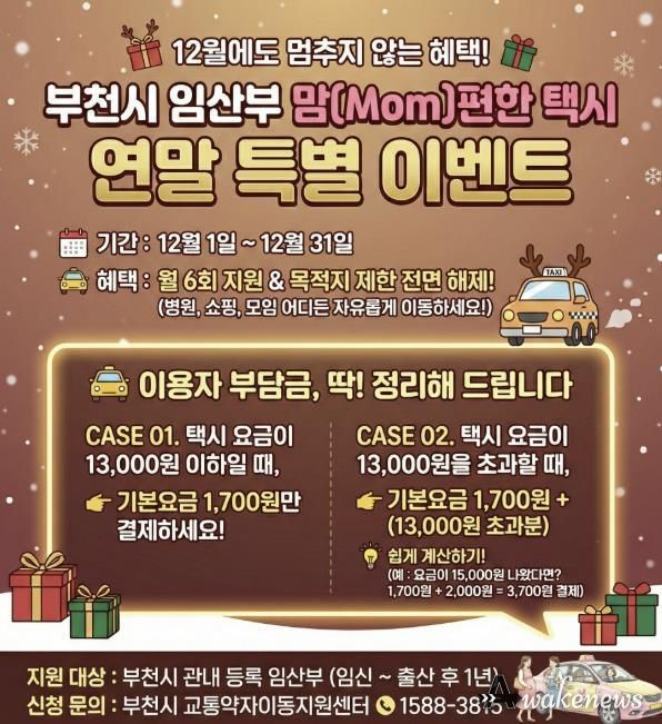 조용익 부천시장은 “지난 두 달간 확인된 시민들의 높은 호응과 수요를 반영해 12월에도 혜택을 이어가게 됐다”며 “이번 이벤트가 임산부들이 따뜻하고 편안한 연말을 보내는 데 실질적인 도움이 되길 바란다”고 말했다.