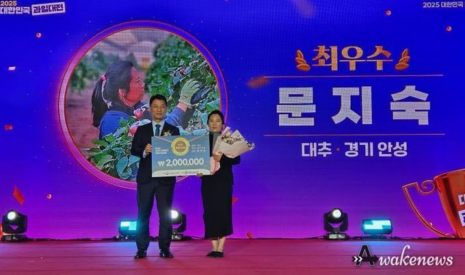 어웨이크뉴스 오경하 기자 | 농림축산식품부 주최, 한국과수농협연합회 주관으로 하는 ‘2025 대한민국 과일산업대전 대표과일선발대회’에서 안성시가 2023년부터 대추부문에서 최우수상, 우수상을 수상하여 3년 연속 대추부문 최고자리에 올랐다. 수상자로 문지숙 대표가 최우수상(농림축산식품부장관상)으로 선정됐고, 조재곤 대표가 우수상(산림청장상)으로 선정됐다.