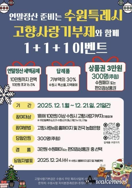 어웨이크뉴스 오경하 기자 | 수원특례시가 고향사랑기부제 참여자 중 300명을 추첨해 상품권을 제공하는 연말 이벤트를 진행한다.