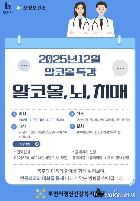 어웨이크뉴스 오경하 기자 | 부천시는 부천시정신건강복지센터와 함께 알코올이 뇌에 미치는 영향을 주제로 한 특강을 12월 8일 오후 2시부터 오정구청 3층 교육실에서 진행한다.